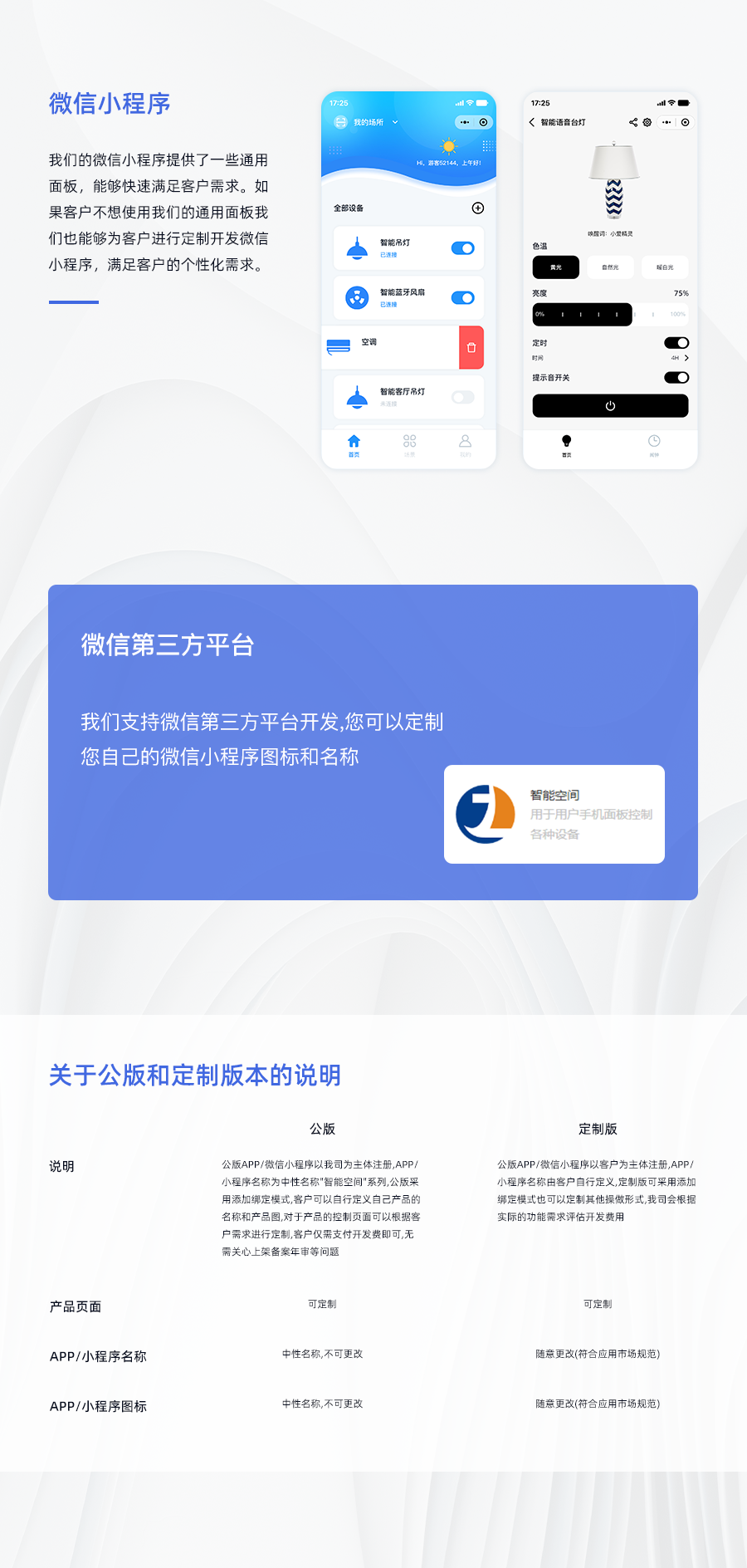 | 说明 | 公版APP/微信小程序以首页为主体注册,APP/小程序名称中包含所有内容,公版采用添加或修改,用户可以自行定义自己产品的名称和产品图片,对于产品的使用范围可以根据客户需求进行定制,客户仅需支付开发费用,无需从以上数据中选择项目 | 公版APP/微信小程序以客户端为主体注册,APP/小程序名称由客户自定义,定制版可采用添加或修改,用户可以自行定义自己产品的名称和产品图片,对于产品的使用范围可以根据客户需求进行定制,客户仅需支付开发费用 |